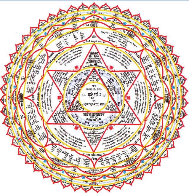 The chart has seven Avaranas i e boundaries. In the last Aavarana, the forms of the God conveyed by 51 symbols Am, Aam etc are present. In other Aavaranas, the presiding forms of stars, planets, years, months, days etc are present.